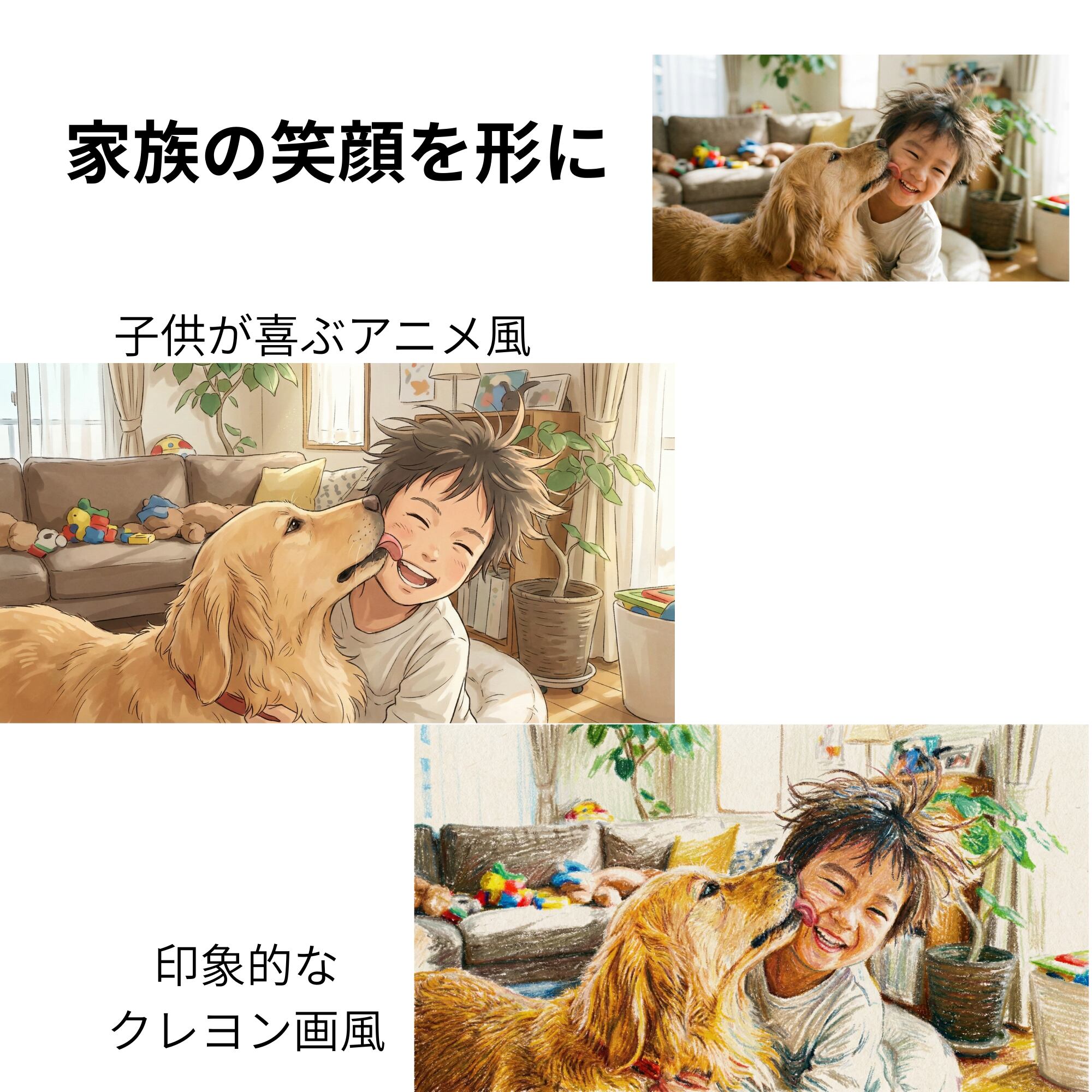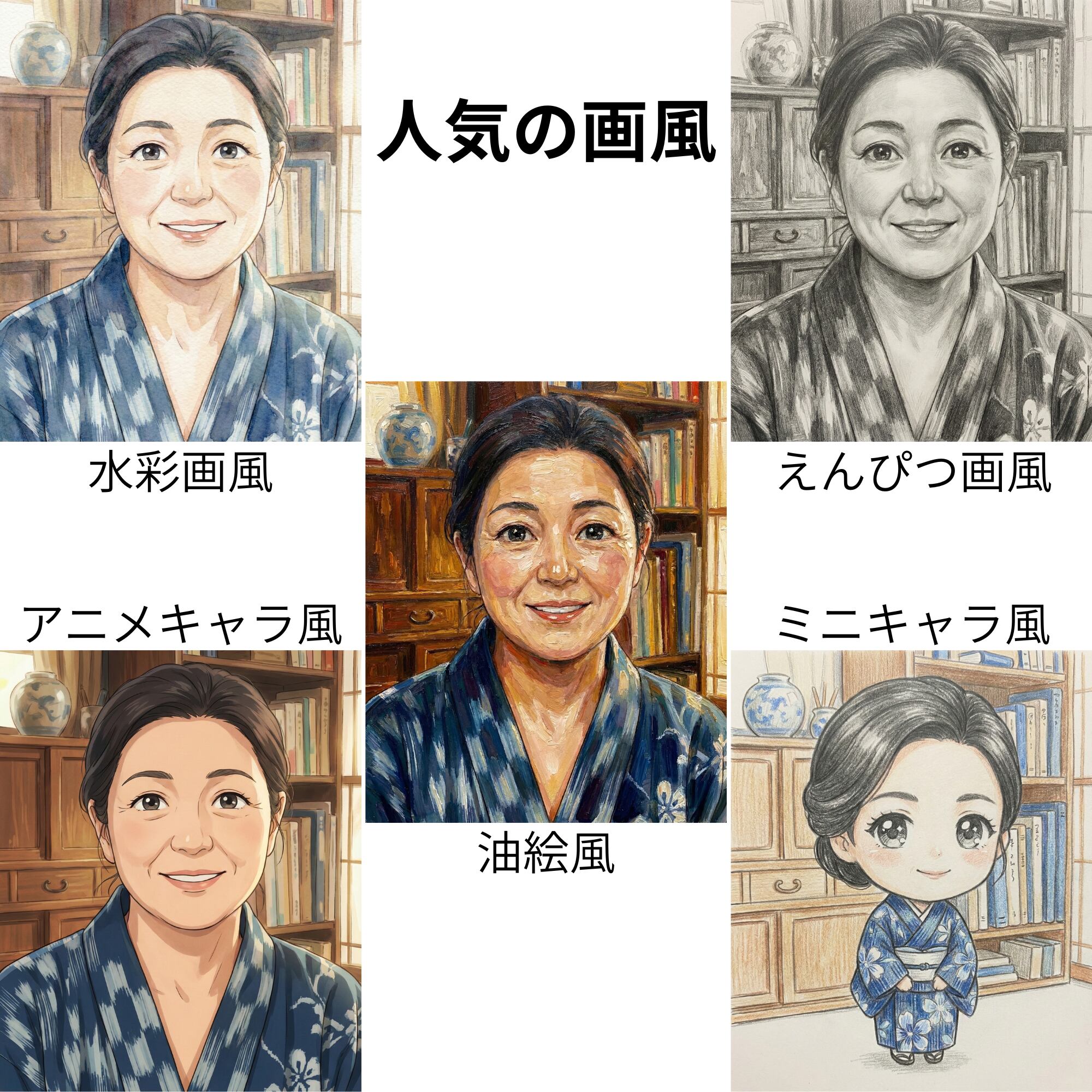 水彩画風/油絵風/アニメ風など、ご希望のテイストでイラスト化します。
